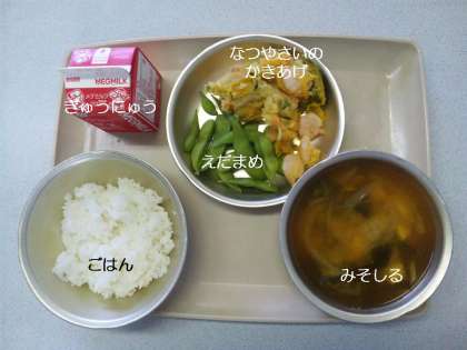 今日の献立は,『みそ汁』『夏野菜のかき揚げ』『枝豆』『ご飯』『牛乳』です。
