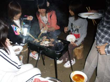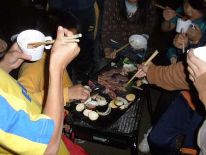 最初,炭に火をつけるのに苦労しましたが,着火後は盛りだくさんの野菜をはじめ魚介類,肉をどの班もたらふく食べました。それでも野菜やお肉があまり食べきれない班がいくつかありました。山の家協会のサービスで子どもたちも満足でした。