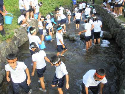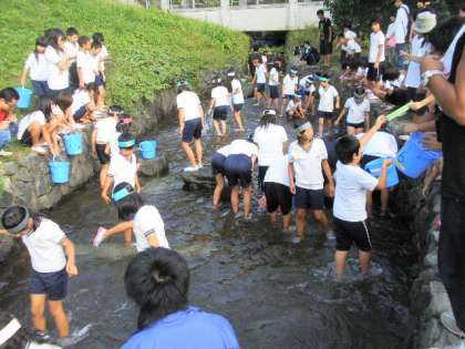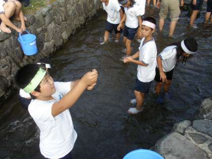 魚(あまご)つかみに挑戦。最初はキャーキャーとこわがっていた女の子も,一度魚にさわったら,後は無我夢中でとっていました。みんなで84匹のあまごがつかめました。子どもたちの笑顔が印象的でした。