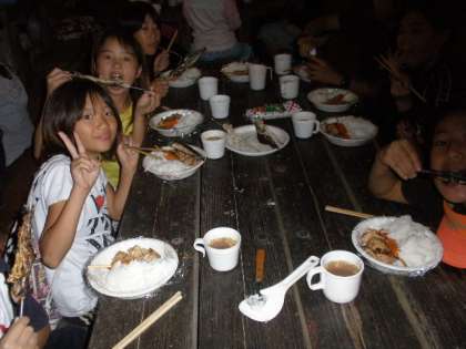 サバイバルクッキングも見事成功。特に竹飯はどの班も上手に炊けて,飯ごうで炊いたごはんよりもおいしかったです。