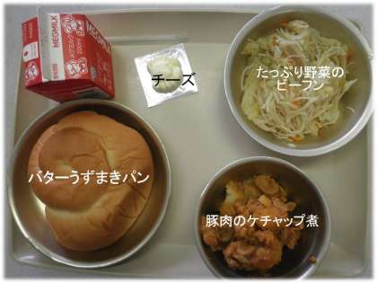 「バターうずまきパン」「豚肉のケチャップ煮」「たっぷり野菜のビーフン」