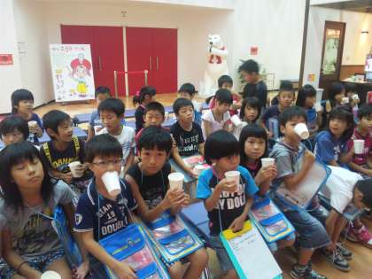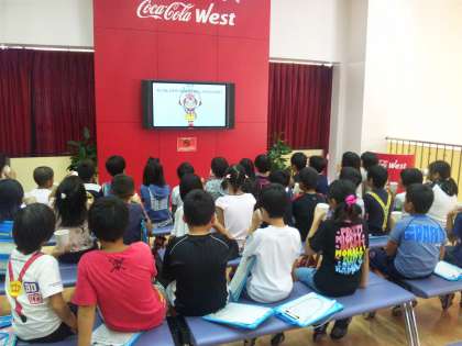 工場に入って,まず子どもたちは,『コカ・コーラ京都工場』で製造されている飲み物を飲ませていただきました。その後,ビデオをもとに『コカ・コーラ』の説明を受けました。