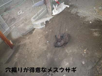オス,メスうさぎとも,屋外飼育場の土の上で寝そべったり,穴掘りをしたりしているので,白ウサギは薄茶ウサギに,白黒のウサギは灰色うさぎになっています。(土で毛が汚れてしまって毛玉になっています)
