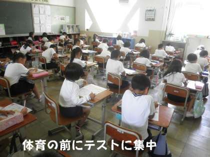 体育の時間の前に教室をのぞくと,全員体育の服装で算数のテストに集中していました。