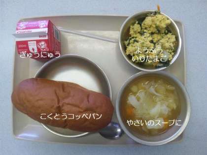 今日の献立は,『野菜のスープ煮』『洋風炒り玉子』『黒糖コペパン』『牛乳』です。