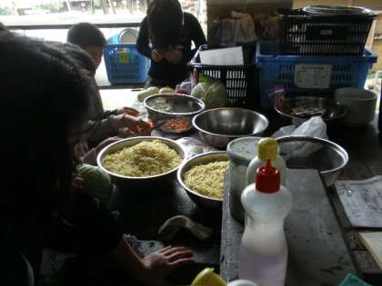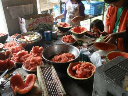 5泊6日の間に野外炊事をなんと9回しますが,いよいよ最後のメインの野外炊事の始まりです。各班で指定されたものを作ります。「ちらしずし」「かやくごはんおにぎり」「イタリアンスパゲティー」「焼きそば」「手羽元のホイル焼き」「ツナサラダ」「フルーツミックス」「ホットケーキ」「焼き鳥」「野菜炒め」を作り,みんなで野外パーティーです。