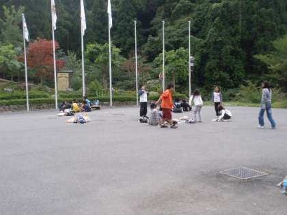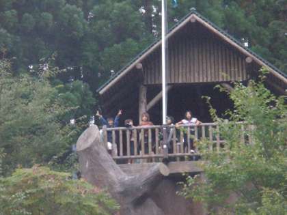 山の家の所員さんも招いて,みんなで野外パーティで盛り上がった後は,冒険の森のアスレチックで楽しんでいます。中には夜の「メインキャンプファイヤー」の出し物を考えている班もあります。