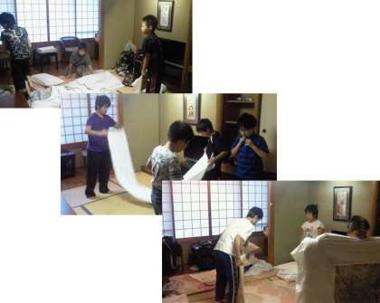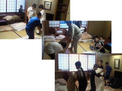 部屋のメンバーで協力してシーツや布団を片付けたり,