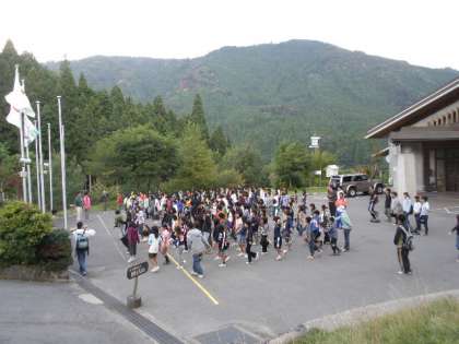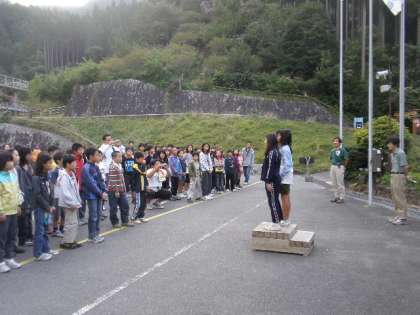 5泊6日の最後の「朝の集い」は洛央小学校の5年生といっしょに合同で行いました。