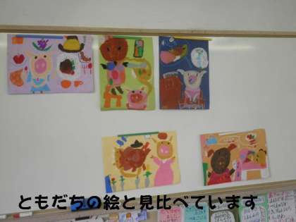 1年生の課題図書は,「こぶたしょくどう」です。みんな,お話の中に入り込んで楽しそうに絵を描いています。