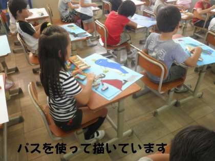 2年生は,ペンギンが登場するお話を絵にしています。先生と一緒に構図を考えながら,パスを使って描いています。