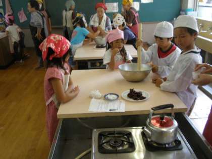 5連休の後,ひさしぶりに子どもたちの元気な顔を見ました。1年生は元気いっぱいです。今日は生活科の授業で,地域女性会の方をゲストティーチャーにお招きして,「お月見団子作り」を教えていただきました。各班一人一人女性会の方に入ってもらって楽しく作りました。