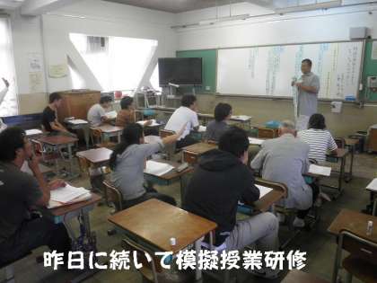 子どもたちが下校後,夕方から昨日に続いて,先生たちは授業力アップを目指して,教材研究会(模擬授業)に取り組んでいます。