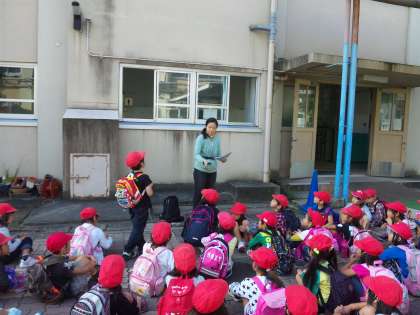 子どもたちは,予定通りに中庭で『出発式』をして,午前8時35分に学校を出発しました。