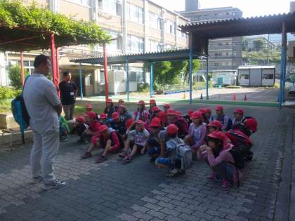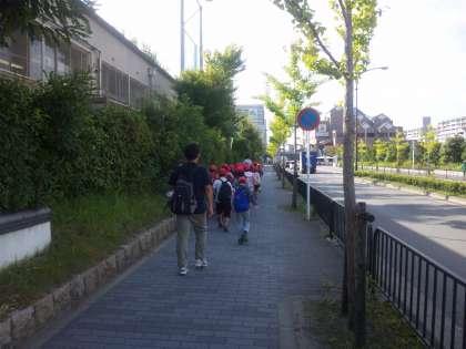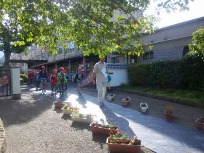 3年生の子どもたちは,予定より少し早く午前8時50分に中に降りてきて,担任の先生から遠足での約束の確認の後,全員元気に学校を出発しました。