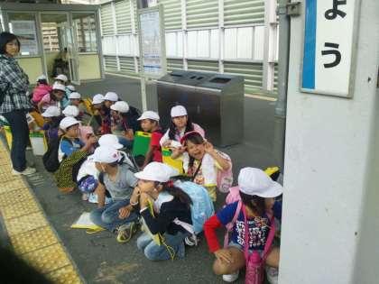 電車を待ってきるときに,友だちと今日の遠足のことについて,楽しかった思い出をいろいろと話しています。