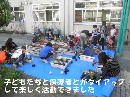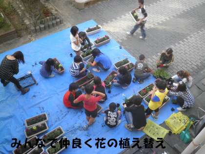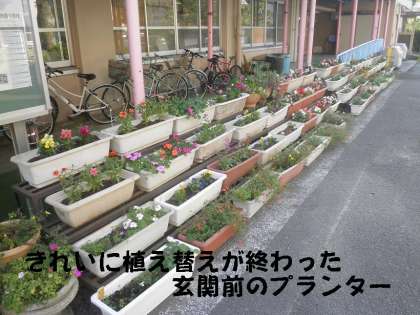 今日の6時間目にPTAの環境厚生部のお母さんたちと,環境委員会の子どもたちとが一緒に,玄関前のプランターの花の植え替え作業をしました。