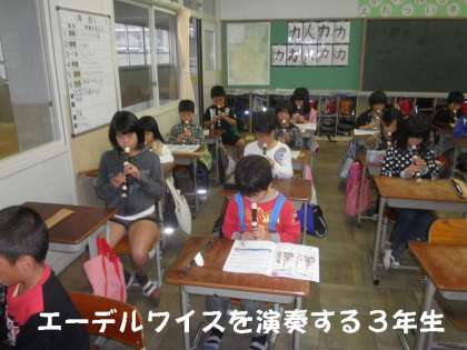 音楽の時間に学習発表会の練習をしています。3年生になって初めて取り組んだリコーダー演奏を披露する予定です。
