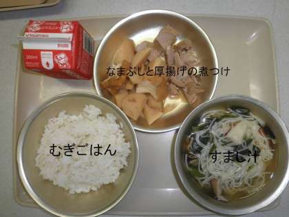 「むぎごはん」「すまし汁」「生ぶしと厚揚げの煮つけ」