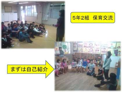 今日は,雨の中ですが5年2組の子どもたちが,お隣の中山保育園に保育交流に出かけています。