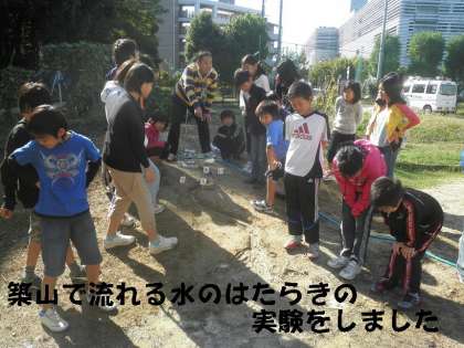 理科で「流れる水のはたらき」の学習をしています。今日は,運動場の築山を利用して,実際に水を流して水の流れ方,川のでき方などを確かめました。