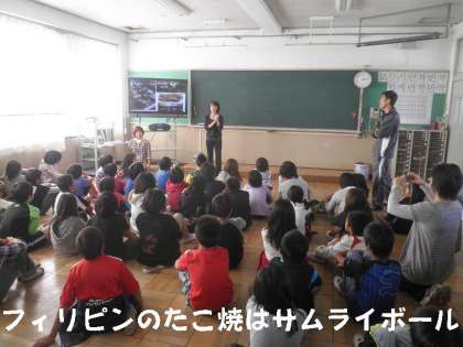 そのお話の中で,日本の「たこ焼」がフィリピンでも屋台で「サムライボール」という名前で人気があり売られているということを聞いて,子どもたちはびっくりしていました。