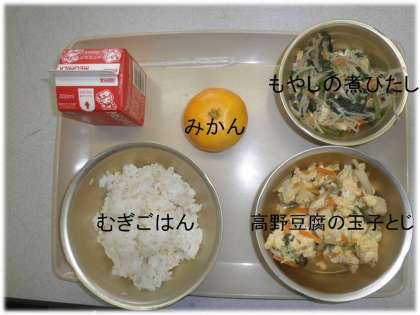 「むぎごはん」「高野豆腐の玉子とじ」「もやしの煮びたし」「みかん」