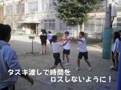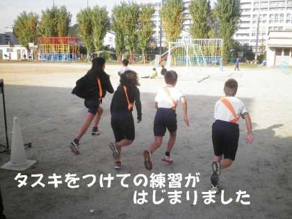 今日は,はじめてタスキをつけて走りました。タスキの受け渡しをスムーズにできるように,これから本番まで練習をしていきます。