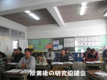 その後,教室で授業を振り返って,授業力向上を目指して,研究協議会を行いました。