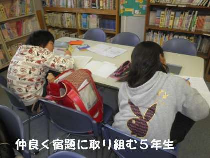 少人数の高学年は,時間を決めて宿題に取り組んでいました。5年生は漢字や算数の宿題を仲良くならんでがんばっていました。