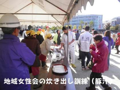 12時前にすべての訓練が終わりました。最後は,醍醐西地域女性会の方が炊き出し訓練として「α米」と「豚汁」を作っていただき,参加者にふるまわれました。