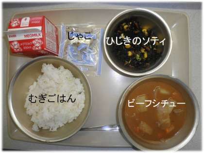 「むぎごはん」「ビーフシチュー」「ひじきのソティ」「じゃこ」