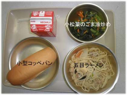 「小型コッペパン」「五目ラーメン」「小松菜のごま油炒め」