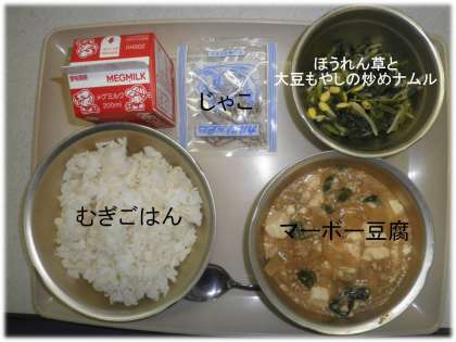 「むぎごはん」「マーボー豆腐」「ほうれん草と大豆もやしの炒めナムル」「じゃこ」