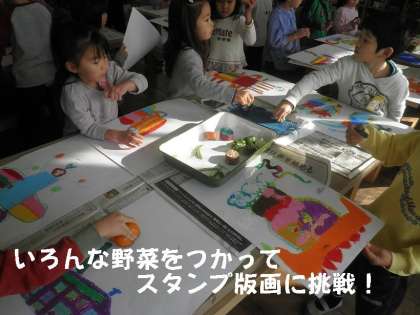 今日は,よごれてもいい服を着て,1,2組合同で図工室に入りました。先週からはじめている野菜を使ったスタンプ版画に挑戦しました。野菜を輪切りにしたおもしろい模様や形が画用紙の上にいっぱいつきました。