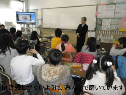 歯科検診の後,学校歯科医 保先生から『むし歯予防について』の話を聞いた後,自分の磨き残しやすい歯を確認するために,歯垢の染出しをしました。