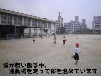「雪だ!,雪だ!」と1年生ははしゃいでいます。2時間目,体育で運動場に出ると,雪が降っていました。