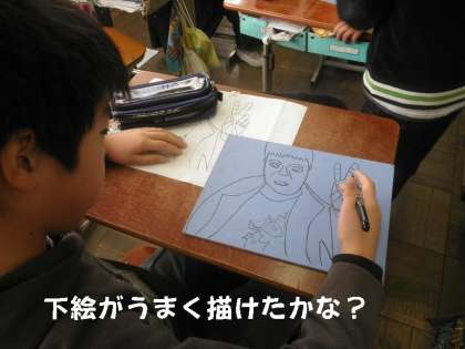 「顕微鏡を見ている友だち」「リコーダーをふいている友だち」「ピースサインをしている友だち」など,いろいろな角度から描いています。なかなかしっかり下絵が完成しました。