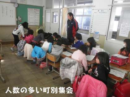5時間目に冬休み前の町別児童集会が開かれました。町別に集合し,集団登校の反省や時間の確認をした後,「冬休みのくらし」を読み合わせをしました。