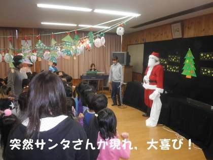 突然,サンタクロースが登場!園児たちは大喜び!5年生はにやにや笑っています。