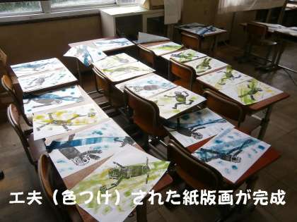 冬休み前に刷りあがった紙版画に,ローラーで色つけ作業をしました。作品がきれいに仕上がるだけでなく,より動きが出てきたように感じました。