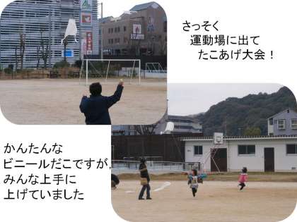 20〜30分で作り上げた「ビニールだこ」をさっそく運動に出てあげました。