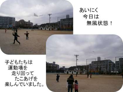 あいにく,今日はまったく風がなく,たこあげには適していませんでしたが,子どもたちは走りまわって,より高く上げようとがんばっていました。
