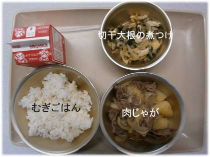 「麦ごはん」「肉じゃが」「切干大根の煮つけ」