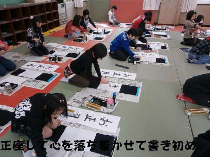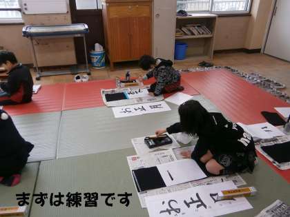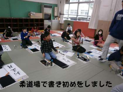3年生が柔道場に行って,正座して書き初めをしました。初めての画仙紙に「お正月」に挑戦!