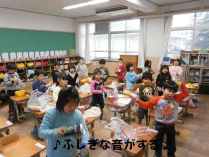先生のオルガンの伴奏に合わせて,子どもたちが持ち寄ったペットボトルや,ビニール袋等を使って,いろいろな音(不思議な音♪)を出してリズムに乗って踊っていました。