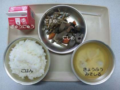 今日の献立は,『京風みそ汁』『煮しめ』『ごまめ』『ご飯』『牛乳』です。