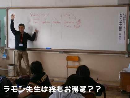 5年生では,今日はリスニング中心の授業でした。ラモン先生は,子どもたちが答えたことばを,すらすらと英語で書き,そして,絵もつけ加えて説明されていました。