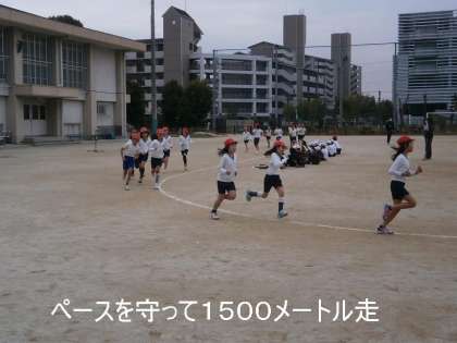 持久走大会に向けて,今週も体育で1500メートルを走ります。運動場トラック15周をペース走でがんばりました。