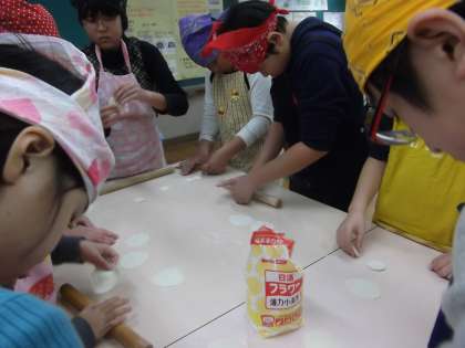 麺棒を使って,生地を丸く薄く延ばすのは難しいけれど,教えてもらって上手に作れました。